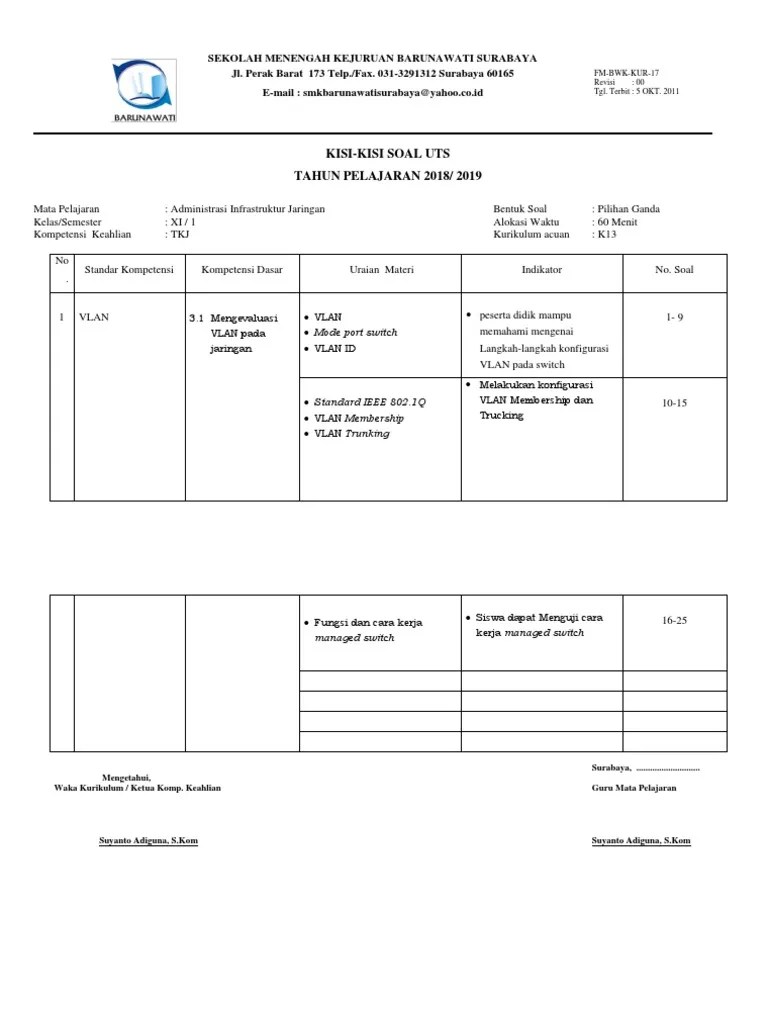 Dibagikan untuk menunjang kebutuhan guru menyambut . View soal dan jawaban uts administrasi infrastruktur jaringan kelas xi tkj 1.docx from accountans 0987 at university putra indonesia of padang yptk. Soal pas 2018 administrasi infrastruktur jaringan xi tkj. 45 contoh soal uts seni budaya kelas 9 smp mts semester genap. 1 laporan konfigurasi vlan xi tkj 2 smkn 8 semarang 2018.